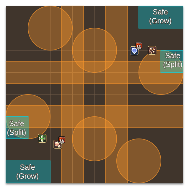 Check whether this is a grow pattern or split pattern. Additionally, it is easier to check the safe rock once the AOEs appear. The safe rock AOE’s center will be within one of the lines.
