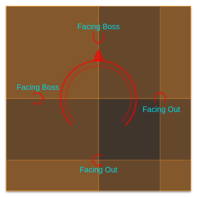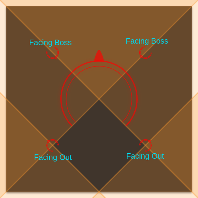 Two of the ghosts will be facing towards the middle of the arena, and two will be facing towards the side. For all patterns, the safe spot is always between the ghosts who are facing off to the side.
